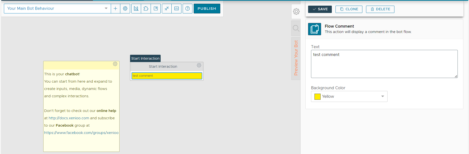 This action display a comment inside the bot flow.