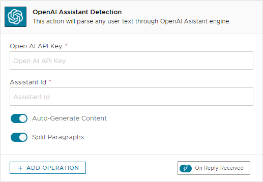 | Auto-Generate Content | If enabled, Xenioo will generate the bubble with the content of the assistant reply   | :no\_entry:                                                              |