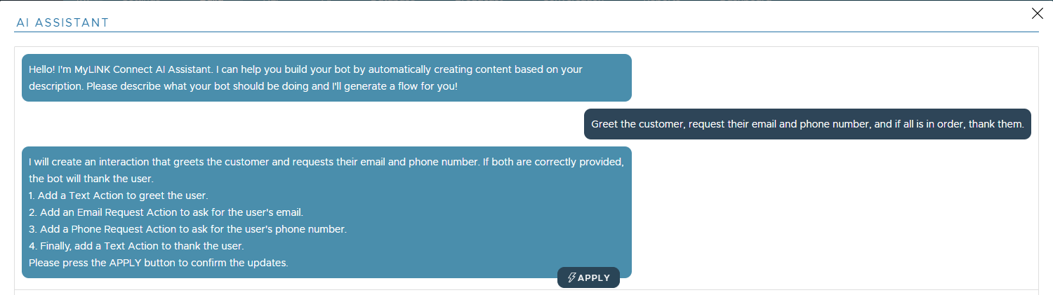 During the same session, it is possible to have a longer chat conversation with the AI ASSISTANT, in this case the history of the conversation will be used for the future prompt.