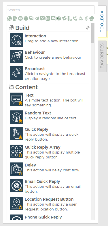 A search bar enables quick action lookup by name. The search dynamically filters both the main Toolbox list and the Favorites list in real time.